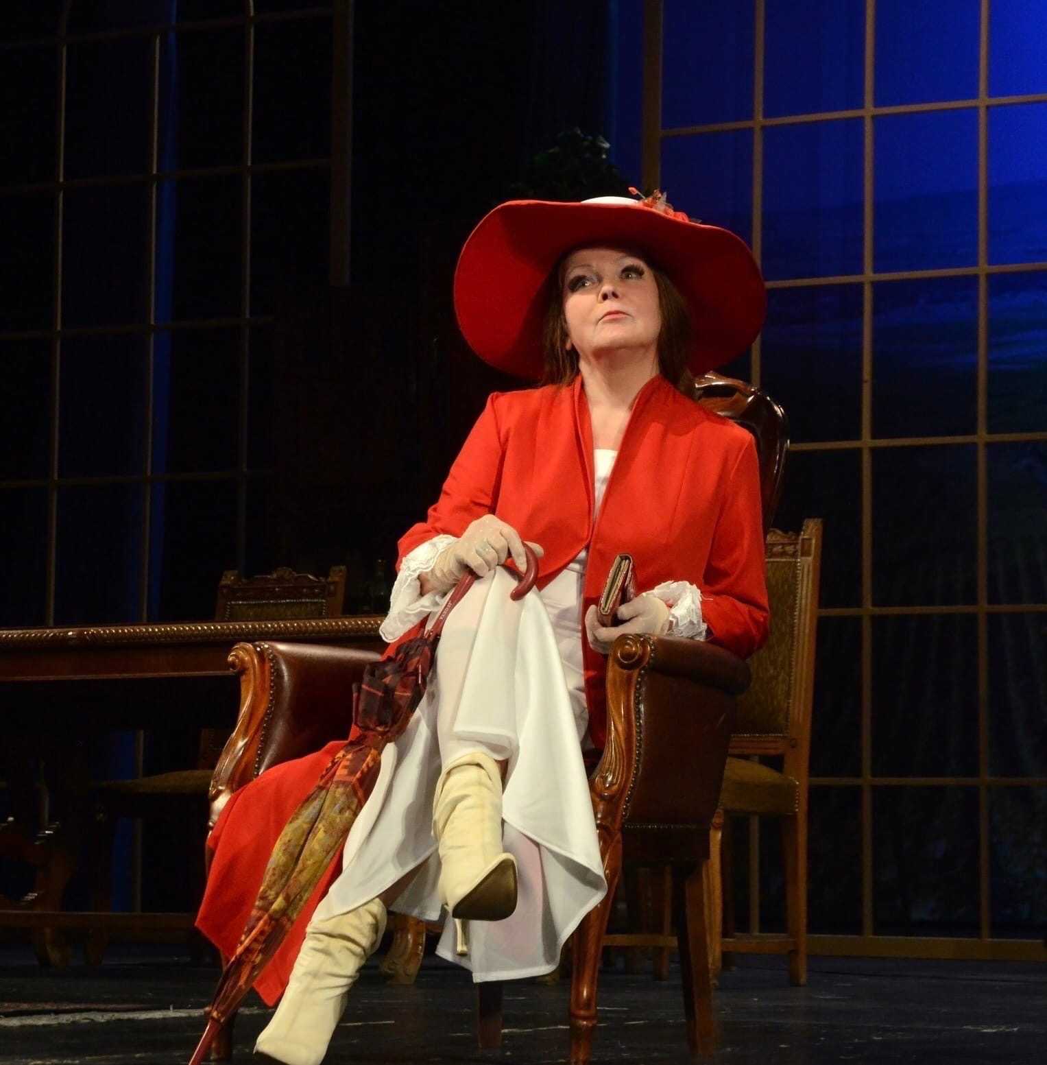 На фото Ольга Пахомова (Овчинникова) в образе Виолетты Десинь в спектакле «Супница.Винная карта одного преступления» (Р. Ламуре) , 2020 г.