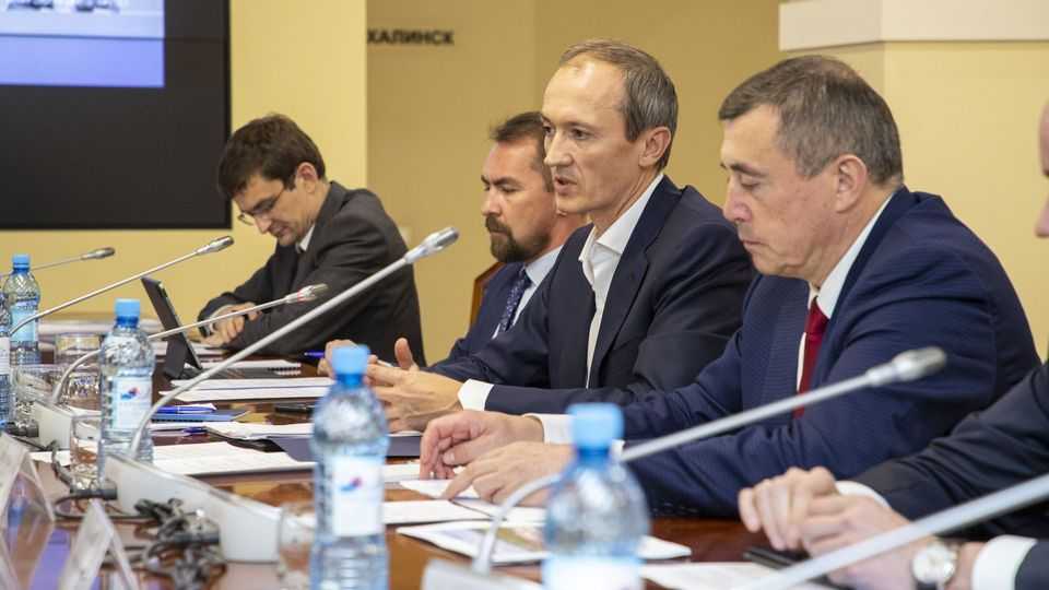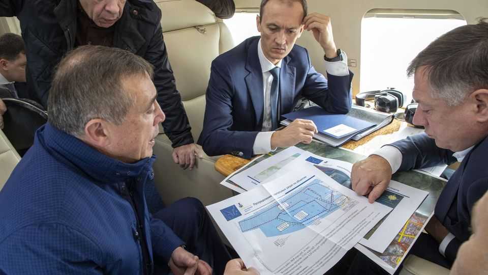 Дмитрий Григоренко и Марат Хуснуллин во время облёта нового города Экополис на вертолёте. С губернатором Сахалинской области Валерием Лимаренко