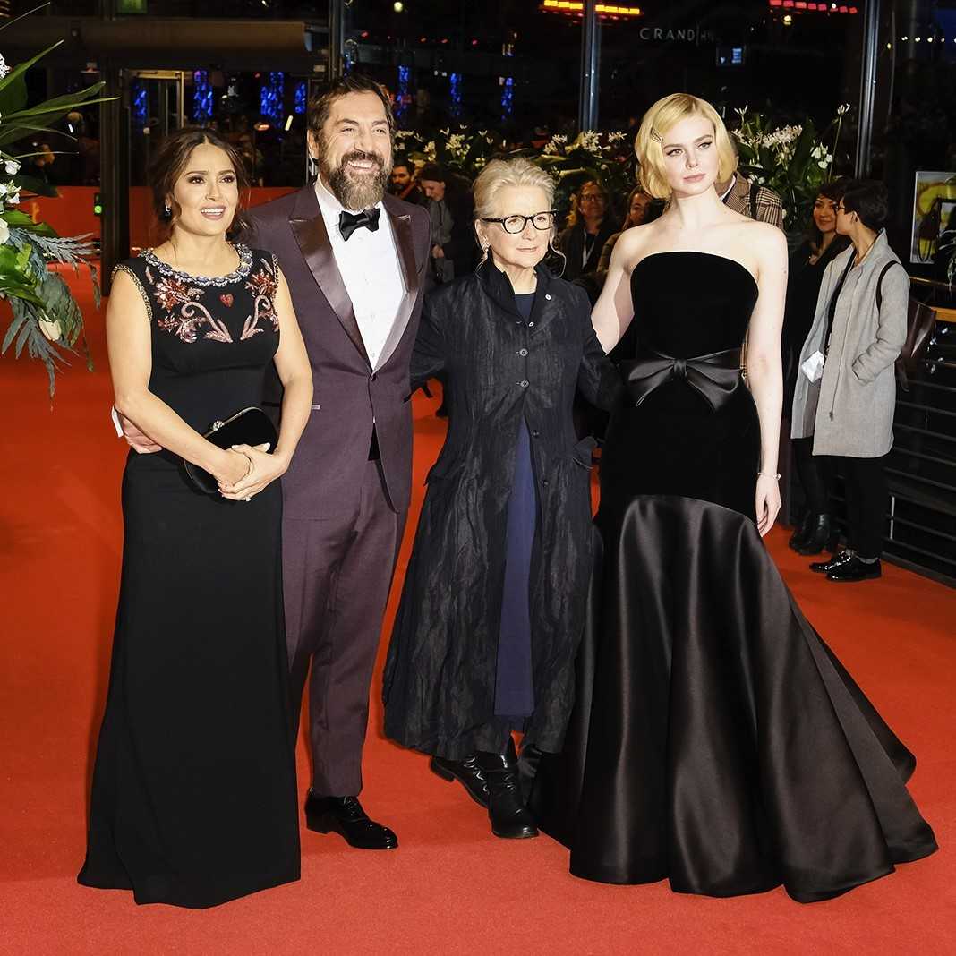 Сальма Хайек, Хавьер Бардем, Салли Поттер, Эль Фаннинг на премьере фильма «Неизбранные дороги» во время 70-го Берлинского международного кинофестиваля, 26 февраля 2020 г.