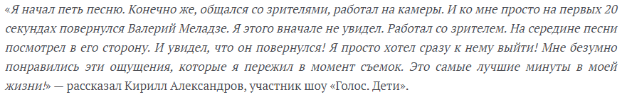 Во время съёмки все поверхности обрабатывались антисептиками через каждые несколько часов. Победителем «Голос. Дети» Кирилл Александров не стал, но у него ещё всё впереди.