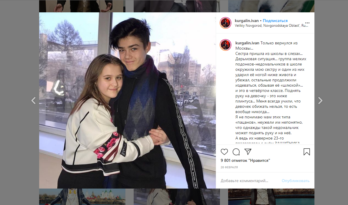Например, в начале 2020 года Кургалин сказал мне, как мало мальчиков из районной школы победили его сестру. Мальчик решил дать этот вопрос, потому что он любит и уважает своего родного человека. Вскоре Ваня рассказала поклонникам поклонникам апелляции в школу головы и наказания за туловище.