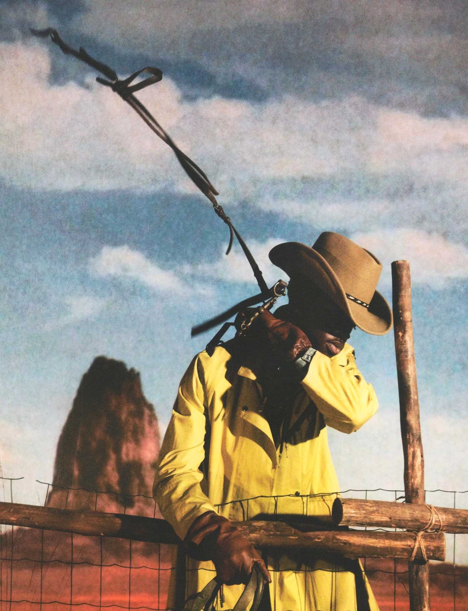 Lil Nas X в нейлоновой куртке с габардиновой подкладкой, солнцезащитных очках и ремне Prada, рубашке, замшевых чапах и перчатках Costume Studio, джинсах Levi’s, шляпе и ремне с металлическими деталями Jessie Western