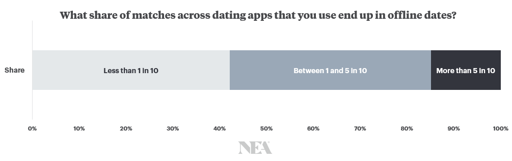 For these users, youth combined with a defining aesthetic irony has created a persistent unintentionality — a certain “this is all just for fun” attitude — on dating apps. It then comes as no surprise that nearly 45% of our respondents reported that less than 1 in 10 matches end in offline dates